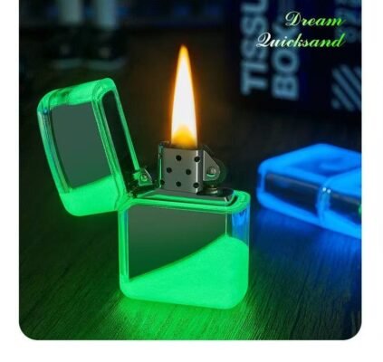 Este encendedor tiene una carcasa transparente que deja ver todo por dentro, con un diseño muy llamativo y moderno. Brilla en la oscuridad gracias a su efecto fluorescente, ideal para quienes buscan algo diferente.